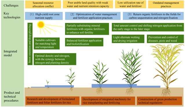 中国水稻的高产主要通过大量施肥和水资源消耗来实现,这导致了严重的环境风险。迫切需要开发和创新绿色技术,同时保证高产和生产效率,以实现水稻的可持续生产。本文系统地分析了影响水稻生产的全国性挑战和地区限制因素。所提出的解决方案集中在三个关键创新上:构建高产种群、地上和地下耦合以及提高土壤肥力。这些绿色高产高效技术的实施显示出保持或提高产量的潜力,同时实现了提高氮利用效率、减少灌溉用水和减少温室气体排放的三个关键改进。为促进大规模采用,应优先开发水稻相关产品,整合水稻旱地轮作系统,并基于这些技术创新建立本地化实施模式。