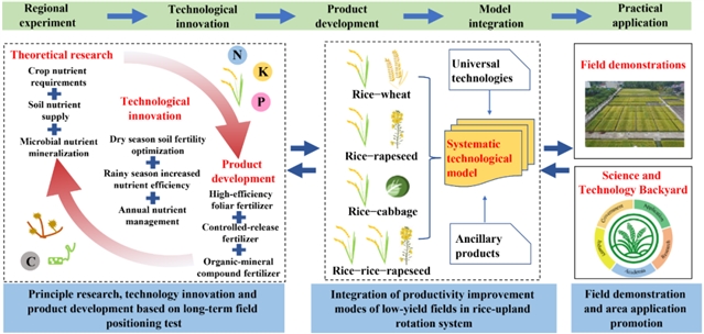 最后,将多种技术和产品整合为综合系统模型,为水稻-小麦、水稻-油菜等轮作或间作系统建立支持性产品和标准化技术,结合土壤改良、精准施肥和可持续病虫害防治等技术,满足双茬不同生长需求,实现资源高效利用与循环。