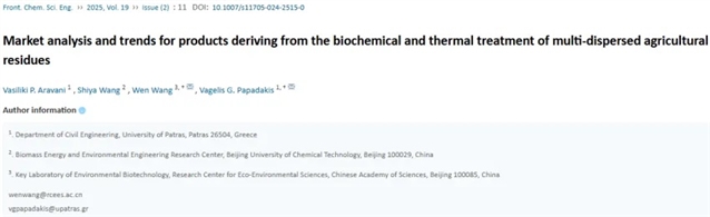 希腊佩特雷大学土木工程系Vagelis G. Papadakis教授和中国科学院生态环境研究中心王雯研究员等在《Frontiers of Chemical Science and Engineering》发表了题为“Market analysis and trends for products deriving from the biochemical and thermal treatment of multi-dispersed agricultural residues”(多分散态农业残余物生化及热处理衍生产品的市场分析与发展趋势)的研究论文,对这类生物燃料的全球市场进行了系统分析,评估了其经济可行性与未来前景。