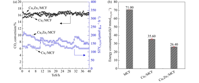 图4 (a) Cu1/MCF和Cu1Zn1/MCF催化剂上非热等离子体催化CO2加氢体系的稳定性测试,(b) MCF、Cu1/MCF和Cu1Zn1/MCF上甲醇生成的能耗。