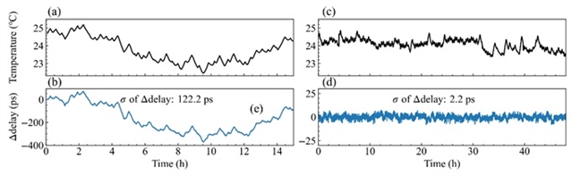 图2:主动反馈系统的性能。(a) 和 (b) 未通过反馈控制进行稳定时的室温和 Δdelay 波动。(c) 和 (d) 激活反馈系统后的稳定 Δdelay。σ 代表 Δdelay 波动的标准差