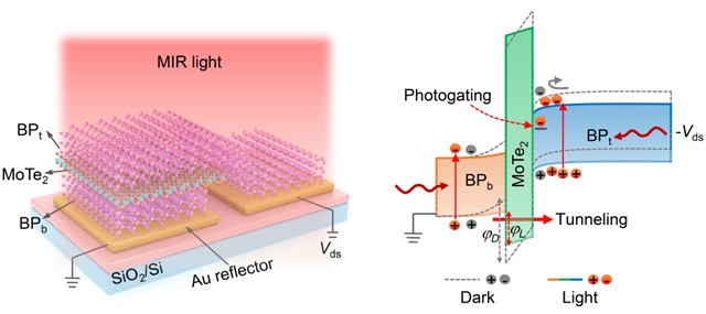 图1. 二维BP/MoTe2/BP双极势垒隧穿异质结高灵敏中红外光探测: (a)器件结构示意图,(b)能带结构示意图。在中红外光照射下,异质结中价带的有效势垒高度相较于暗态显著降低,从而促进光生空穴载流子量子隧穿,产生显著隧穿光电流。