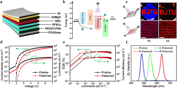 图4:原始和图案QLED的器件性能。(a) QLED器件结构及 (b) 对应的能级图; (c)图案化红色QLED器件的PL(左)和EL(右)图像, 比例尺3 mm; (d) J-V-L和 (e) EQE-CE-L的原始和图案红色器件的性能; (f) RGB器件的EL(实线)和PL(虚线)光谱
