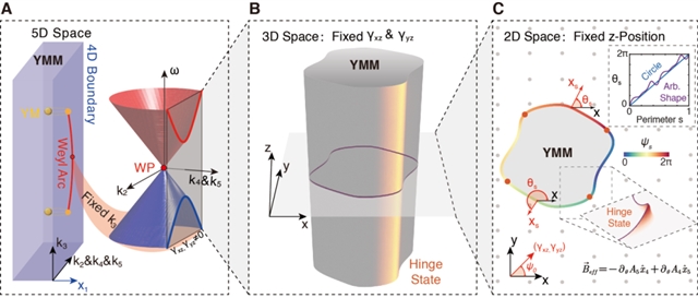 研究首先从杨单极子等效介质的拓扑表面特性入手,拓扑非平庸的二阶陈数c2,其体边对应关系体现在四维边界上存在的三维费米超曲面和一维外尔弧,如图1(a)所示。在三维实验室空间中,当满足|kz|<kYM时,c2拓扑不变量保证了介质柱与空气的界面处的边界态存在交点,在合成高维空间中,这些交点对应于合成外尔点,具有非平庸的一阶陈数c1。对于法线沿x方向的表面,给定kz后,其表面哈密顿量可通过k·p近似方法解析推导得到: