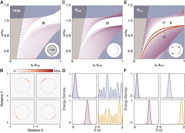 研究团队基于有限元模拟,全局平面波展开及局域规范场近似等不同方案,对圆柱结构的能带及场分布特征进行了理论计算,结果如图2所示,不同方案得到的结果表现出高度的一致性。值得强调的是,圆柱几何结构本身不具有各向异性特征,拓扑棱态模式完全源自于电磁介质固有的本征拓扑属性。