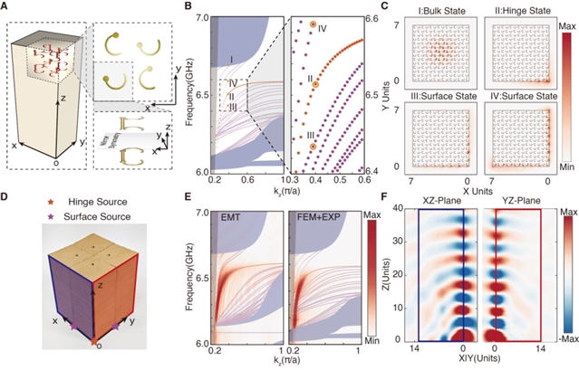 为进一步验证理论预测,研究团队设计了一种由金属螺旋结构单元构成的超构材料样品,用以实现合成高维空间杨单极子介质的特殊电磁等效媒质响应,并采用有限元法模拟分析了方型截面构型下柱结构的能带结构及场分布特征,如图3(a-c)所示。结果显示,在边界态的带隙中,存在独立的HOTI模式,其场分布特征高度局域于截面的右下角,清晰展现了其高阶拓扑特征。