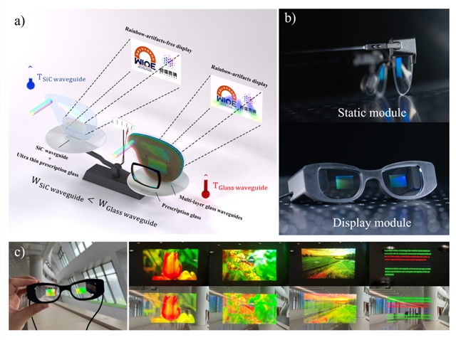 图1:(a) SiC波导(左)与传统玻璃波导(右)的对比;(b) SiC波导静态模组(上)和整机演示模组(下);(c) AR场景整机演示模组测试结果
