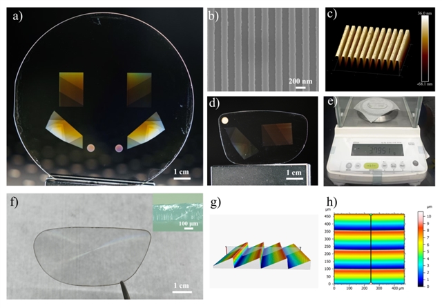图2:(a) 量产的4寸SiC波导晶圆;(b) SiC纳米光栅的扫描电子显微镜(SEM)图像;(c) SiC纳米光栅的原子力显微镜(AFM)图像;(d)经过封装与激光切割后的SiC波导镜片;(e) 单目SiC波导镜片重量;(f)激光切割后的菲涅尔近视镜片;(g-h)菲涅尔近视镜片的共聚焦显微镜图像