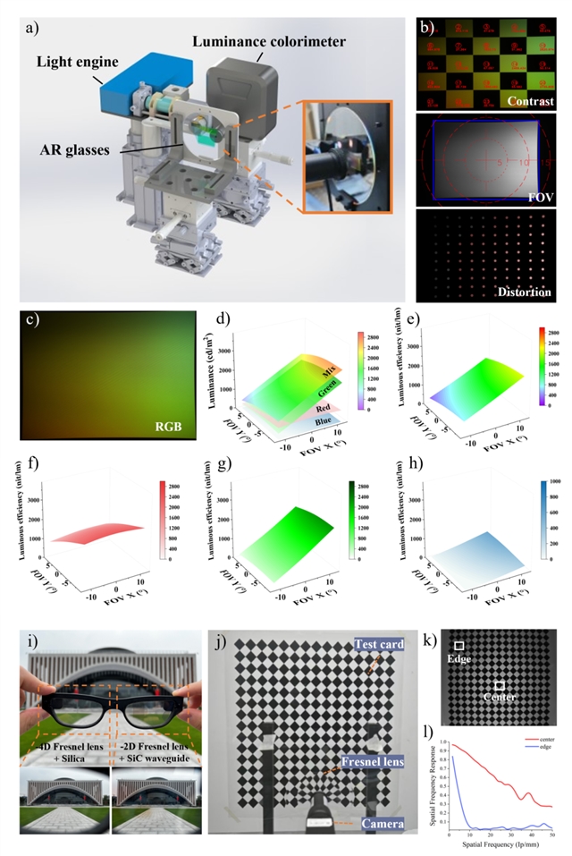 图3:(a) 自主搭建的光学测试平台;(b) 对比度(上)、视场角(中)和畸变(下)的测试结果;(c) RGB全彩显示;(d)SiC波导在632、524和467 纳米波长下混合与分离的耦出亮度;(e-h)混合与分离的耦出光效;(i)超薄菲涅尔透镜演示;(j)图像清晰度测试装置示意图;(k)透过菲涅尔透镜观察的视图照片;(l)中心和边缘区域的空间频率响应