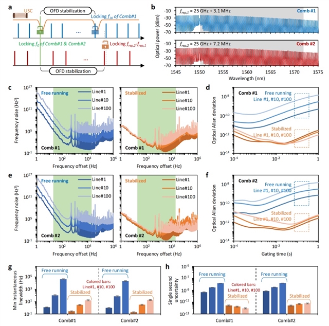 图2:全锁定双微腔光频梳的稳定方法和效果。a,双梳稳定策略;b,双梳光谱选择;c,Comb# 1梳齿的光学频率噪声;d,Comb# 2梳齿频率的Allan方差;e,Comb# 1梳齿的光学频率噪声;f,Comb# 2梳齿频率的Allan方差;g-h,锁定前后,双梳的瞬时线宽和秒稳