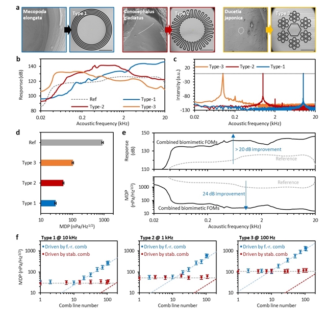 三类仿生光纤麦克风实现了在不同带宽下的高响应度,分别在20 kHz、800 Hz和60 Hz处响应最高分别达到146.1 dB、141.4 dB和132.4 dB,合并使用时,后可实现42 Hz-20 kHz全频带覆盖,响应度均超过130 dB。在全锁双孤子光频梳的并行驱动下,各FOM在37 mPa声压激励下信噪比(SNR)均超过108 dB,据此,最小可探测声压(MDP)最低达29.3 nPa/Hz1/2,灵敏度达商用传感器25倍以上。如图3b-e所示。