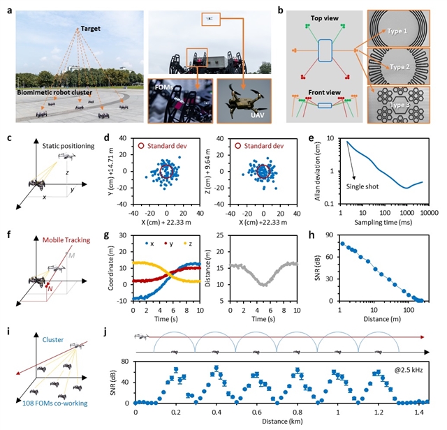 图4:双孤子微梳仿生声场感知系统的声学定位能力。a-b,仿生化的室外部署方式,其声学传感探头布置在不同的位置,相干同步解调赋予了其声学定位能力;c-d,针对静态发声目标的定位;e,定位准确度;f-g,针对动态发声目标的跟踪能力;h,最大探测距离;i-j,更多的传感器复用,能更大范围的拓展声场感知区间
