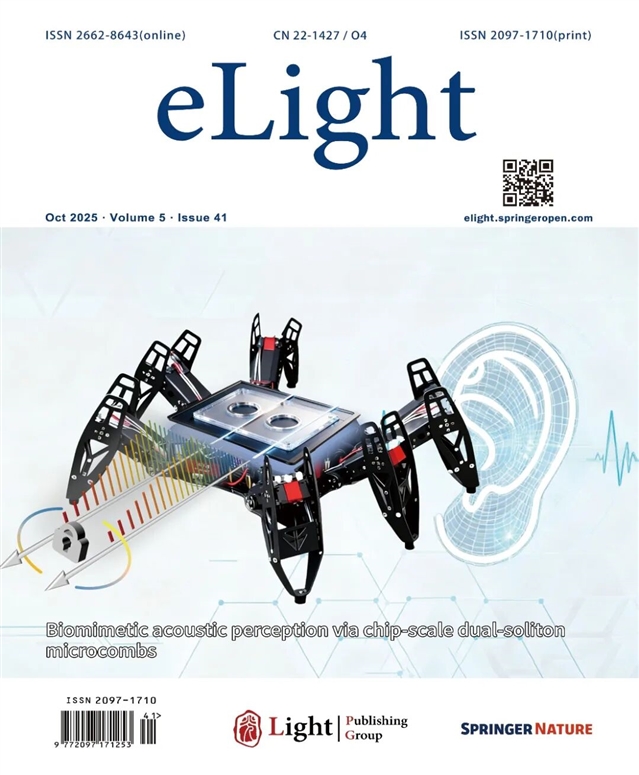 近日,来自多个单位的研究者们,共同在eLight(影响因子32.1,入选两期卓越计划)上发表题为“Biomimetic acoustic perception via chip-scale dual-soliton microcombs”的研究论文,提出了一种基于仿生听觉感知策略的光电子混合集成声音探测方案。以全锁定光频梳为核心,同步驱动108路仿生微结构增强的光纤麦克风,并模仿昆虫听觉器官的空间布局,实现了数十nPa/Hz1/2级的超灵敏声波探测,cm级精度的发生源空间定位,以及>90%准确率的多目标声纹识别。该技术创新性地跨学科融合了集成光梳光子学、片上硅基光子学、光纤光学和光电子微系统融合技术,赋予了“类昆虫群”的复杂环境声场解析能力,有望推动新一代光子智能感知技术的进展。
