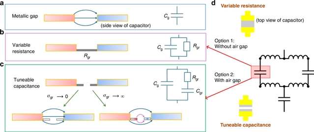 传统超材料调制器通过石墨烯电阻性阻尼调节共振,导致效率受限。本研究将石墨烯设计为从金属电容板延伸的纳米级可调电容(图1),通过改变其导电状态,调控电容值并偏移谐振频率。当石墨烯导电性趋近零(绝缘态)或无穷大(导体态)时,电容值在空气间隙与金属间隙间切换,这种电容调谐机制可在更宽频段内实现高效调制,且避免电阻阻尼的固有损耗。