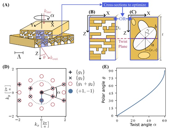 在光学波束操控领域,传统衍射元件的色差局限与动态调控需求的矛盾长期存在。近日,比利时那慕尔大学Michaël Lobet团队与斯坦福大学Shanhui Fan团队合作,提出了一种基于扭曲双层光子晶体的光束偏转新机制,通过扭转角诱导的衍射级次选择与闪耀效应(Blazing effect)调控,实现了高效可重构的光束转向。研究团队基于粒子群优化算法,系统探索了迷你层、椭圆结构等三类设计模板,发现最优器件通过特定倾斜角可以实现类似闪耀光栅的衍射级次抑制,在0至30度扭转角范围内效率超90%,突破了传统方法在动态调控与效率间的权衡瓶颈。该研究成果发表于国际顶级学术期刊《Light: Science & Applications》上,题为“Twist-Induced Beam Steering and Blazing Effects in Photonic Crystal Devices”。