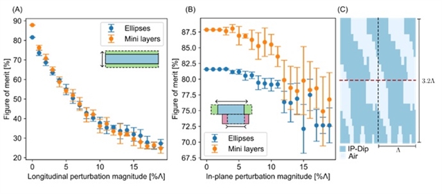 在材料工程与制造工艺方面,团队开发出基于倾斜刻蚀的简化制备方案(见图2)。通过将复杂三维结构简化为平行四边形截面的二维光栅,结合陶瓷树脂立体光刻或电子束倾斜刻蚀技术,实现纳米级精度控制。实验表明,该方案在C波段(1550nm)实现层厚误差<2%(31nm)的制造鲁棒性,且椭圆结构模板相比迷你层设计,将工艺敏感性降低 30%,为大规模集成提供可行路径。