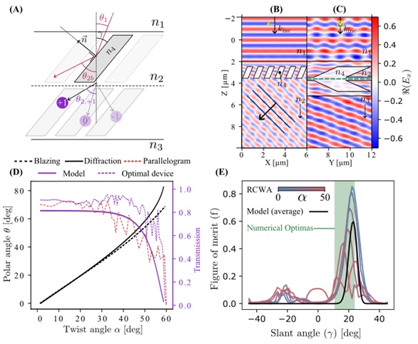 研究团队基于逆向设计的扭转双层光子晶体,成功实现了高效、大角度的光束转向,突破了传统光学元件在动态调控与效率间的瓶颈。实验结果表明,优化后的结构在0 - 30°扭转角内,可将大于90%的能量耦合至单一衍射级次,实现±30°的光束偏转,且对TE/TM偏振光均具鲁棒性。
