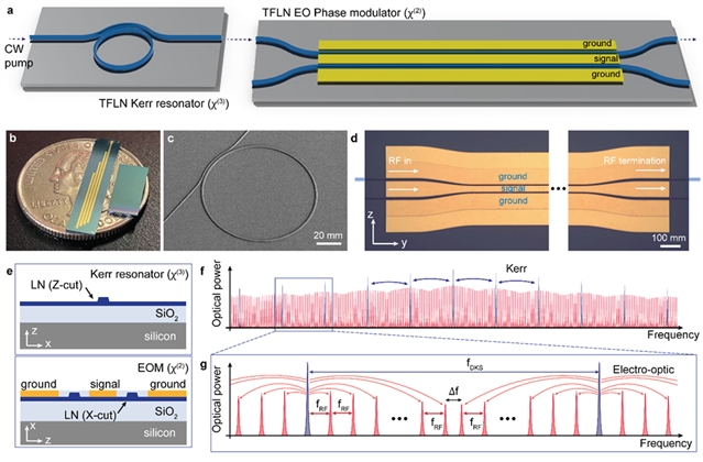 近期,哈佛大学Kiyoul Yang和Marko Lon?ar课题组,提出并实验证明了一种全新架构的混合克尔-电光频梳(Hybrid Kerr-electro-optic frequency comb),在一个小小的薄膜铌酸锂芯片上,首次实现了: