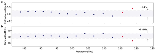 电光调制器采用2 cm长的行波电极设计,在29 GHz微波驱动下,可在多个通信频段(L/C/S/E)生成对称侧带,完成对原始克尔频梳的精细分频操作,具备优异的Vπ性能和带宽一致性。