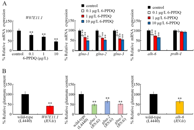 6-PPD醌(6-PPDQ)广泛分布于环境中。在秀丽隐杆线虫中,我们首先通过分析谷氨酸含量、相关基因表达以及这些基因RNAi的表型,探究了6-PPDQ对谷氨酸合成和受体功能的影响。此外,我们在6-PPDQ暴露后进行谷氨酸处理,以探究谷氨酸对抗6-PPDQ毒性的潜在药理作用。暴露后,谷氨酸含量降低了0.1~10 μg/L 6-PPDQ,这是由于W07E1.1、glna-1/2/3和alh-6表达下降所致,这些基因分别控制α-酮戊二酸、谷氨酰胺和脯氨酸合成谷氨酸。W07E1.1、glna-1/2/3和alh-6的RNAi降低了6-PPDQ 暴露线虫的谷氨酸含量,并使其对6-PPDQ 毒性敏感。在谷氨酸转运蛋白基因中,glt-1的表达在0.1至10 μg/L 6-PPDQ 处理下降低。此外,0.1至10 μg/L 6-PPDQ 处理下,谷氨酸受体基因(glr-1、glr-2 和 glr-4)的表达降低,而W07E1.1、glna-1/2/3、alh-6和glt-1的RNAi处理降低了这些基因的表达。这些受体基因的RNAi导致对6-PPDQ毒性的敏感性,并且daf-7、jnk-1和dbl-1被确定为神经元glr-1、glr-2和glr-4的靶基因。此外,5mM谷氨酸可抑制6-PPDQ毒性并增加glr-1、glr-2和glr-4的表达。我们的研究结果表明,6-PPDQ暴露可能干扰谷氨酸合成并影响谷氨酸受体的功能,这些谷氨酸与6-PPDQ毒性诱导相关。