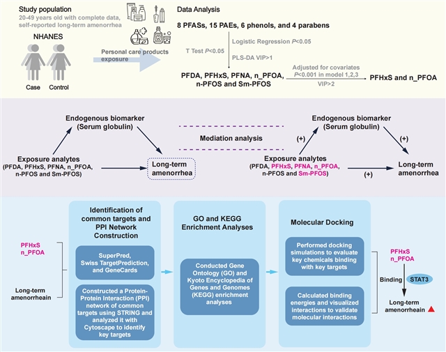 个人护理和消费品中的化学物质被怀疑会扰乱内分泌功能并影响生殖健康。然而,混合暴露与长期闭经之间的联系尚不清楚。本研究分析了684名女性(2013至2018年全国健康与营养调查)的数据,以评估8种多氟烷基物质(PFAS)、15种邻苯二甲酸酯(PAE)、6种苯酚和4种对羟基苯甲酸酯的暴露情况。采用多种统计模型进行稳健性检验和中介效应分析,探讨其与长期闭经的关联以及血清球蛋白的作用。通过整合关键化学物质与长期闭经交叉点的靶点分析、通路分析和靶点验证,识别了其生物学机制。结果表明,长期闭经女性的全氟癸酸、全氟己烷磺酸(PFHxS)、全氟壬酸、正全氟辛酸 (n_PFOA)、正全氟辛烷磺酸和全氟甲基庚烷磺酸异构体的暴露水平较高。不同调整后的逻辑回归模型一致发现,PFAS浓度升高与长期闭经风险增加之间存在显著关联,偏最小二乘判别分析也证实了这一点。中介效应分析显示,血清球蛋白在PFAS暴露与长期闭经之间的关系中起部分中介作用。网络和靶点分析表明,PFHxS和n_PFOA可能与信号转导和转录激活因子3(STAT3)相互作用。这项研究强调了PFAS暴露(尤其是PFHxS和n_PFOA)与长期闭经之间的显著关联,其中血清球蛋白和STAT3是潜在机制中的介质。