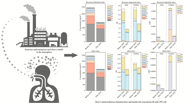 本研究调查了中国50个城市PM2.5中9种大气重金属(铅、砷、锰、镍、铬、镉、锌、铜、铁)的时空变化趋势及健康风险,比较了《大气污染防治行动计划》实施前(2014至2018年)和实施后(2019-2021年)资源工业城市(RIC)和一般城市(GC)的差异。2018年后,除铁外,所有金属浓度均显著下降(33至77%),低于PM2.5的降幅(25%)。地理空间分析显示,中国南北地区重金属浓度升高,与工业和矿业热点地区一致。虽然资源工业城市的金属浓度持续高于一般城市,但2018年后城市间差距缩小,资源工业城市的降幅更大。2018年之前,综合非致癌危害指数(HI小于1)仍低于安全阈值,但儿童的综合致癌风险总量(CRT)超过10−4,主要受砷和六价铬(Cr(VI))的影响。区域性工业区(RIC)的HI比普通地域性工业区(GC)高1.5到2.0倍。2018年后,CRT下降了69.0到71.1%,与重金属含量的降低一致。尽管CRT有所改善,但仍需要针对砷(CRT贡献率为81.1到86.2%)和六价铬(贡献率为11.7到14.0%)进行有针对性的减排。这些发现证实了该政策在控制工业和车辆排放方面的有效性,但也强调了在资源密集型地区实施针对性金属的控制措施以保障儿童健康的重要性。