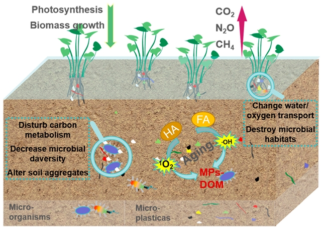 湿地是调节碳封存和减缓全球气候变化的关键生态系统之一。然而,微塑料(MPs)对湿地碳动态的干扰不容忽视。本综述探讨了MPs对湿地生态系统碳循环的影响,重点关注其潜在的物理化学和微生物机制。湿地沉积物中MPs的积累会严重破坏植物根系功能,干扰水分、养分和氧气的运输,从而降低植物生物量的发育。虽然MPs可能暂时增强碳储存,但它们最终会加速有机碳的矿化,导致大气中二氧化碳排放增加,并破坏长期碳封存。该过程的一个关键方面涉及由MP上的选择性微生物定植驱动的微生物群落结构的变化,这会影响有机碳分解和甲烷产生,从而对温室气体排放构成威胁。值得注意的是,可生物降解的微藻(MPs)产生的溶解有机物会促进共存MPs的光老化,增强老化MPs释放有害物质,并因代谢活动紊乱而进一步影响微生物相关的碳动态。因此,深入了解MPs对湿地健康和碳循环的不利影响及其机制至关重要。未来的策略应结合微生物调控和生态工程技术,以开发有效的方法,维持受MP污染影响的湿地的可持续碳封存能力。