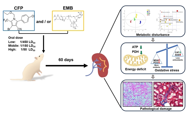 农药氯芬那吡 (CFP) 和甲氨基阿维菌素苯甲酸酯 (EMB) 的残留经常共存于环境中并可在体内蓄积。为了了解这两种化学物质对健康的影响,我们研究了它们对肾脏的影响。在本研究中,大鼠分别以低/中/高剂量(1/3/9 mg/kg/day 和 0.2/0.6/1.8 mg/kg/day)经口管饲给予CFP和/或EMB60天。收集肾脏和血清样本,并分析和检查血清生化和肾脏组织病理学变化。使用气相色谱-质谱法分析肾脏代谢组的改变。结果表明,联合暴露于CFP和EMB可升高血液中的尿素氮水平并诱导病理损伤,表现为肾小管上皮细胞变薄、肾小球形态异常和纤维化区域增加。CFP和/或EMB干扰谷胱甘肽代谢和碳水化合物代谢,导致肾脏代谢组发生改变,并诱导肾脏组织细胞发生氧化应激。此外,CFP降低肾脏ATP含量,并抑制丙酮酸PDH活性。这些结果表明,长期暴露于环境相关浓度的CFP和EMB可导致肾脏代谢组发生改变、氧化应激和能量供应不足,从而可能导致肾脏组织病理学损伤。
