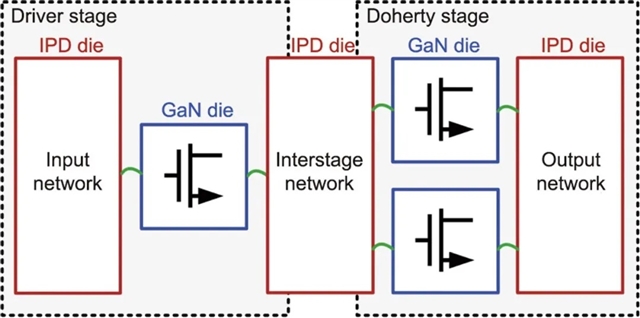 研究团队指出,随着5G基站天线通道数增加到64路甚至128路,射频功率放大器数量同步激增,传统印刷电路板方案在尺寸和成本上已难以支撑商用部署。单片微波集成电路(MMIC)虽可缩小体积,但全集成方案需要消耗大量昂贵GaN晶圆。论文提出的MCM混合集成思路仅将晶体管部分用GaN工艺实现,其余匹配、偏置、功分等无源网络转移到成本更低的GaAs IPD工艺,GaN芯片面积缩减至传统MMIC的20%以下,显著降低了物料成本。
