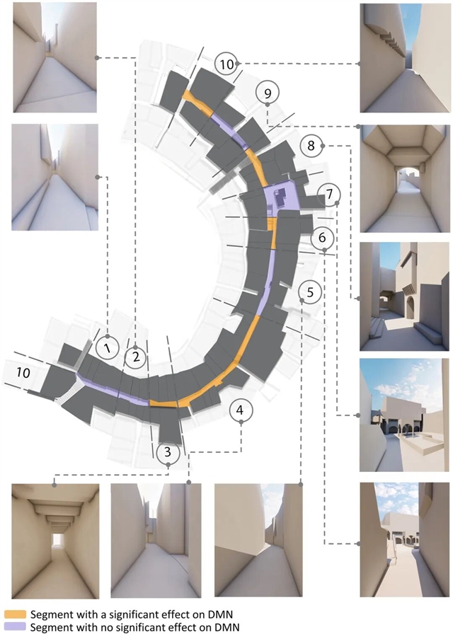 ▲ 图五:含默认模式网络(DMN)影响效应的曲线路径条件分段。图 1 与图 2:标志曲线路径条件的起始部分,无显著建筑特征,视线聚焦于墙体的弯曲形态;图 3:带顶棚的通道,通道宽度增加,空间封闭性高,且无法看到天空;图 4:路径宽度发生变化,随后连接一段带顶棚的通道;图 5:以路径的弯曲形态为主要特征,视线受阻;图 6:终点为古老市集,空间封闭性显著降低;图 7:位于古老市集内部,空间封闭性呈下降趋势;图 8:以与另一条路径的交叉口为特征,此处有一座拱券通向带顶棚的通道;图 9:一段带顶棚的通道;图 10:位于路径末端,空间封闭性高,正前方为墙体,可部分看到一处托臂构件。©本文作者