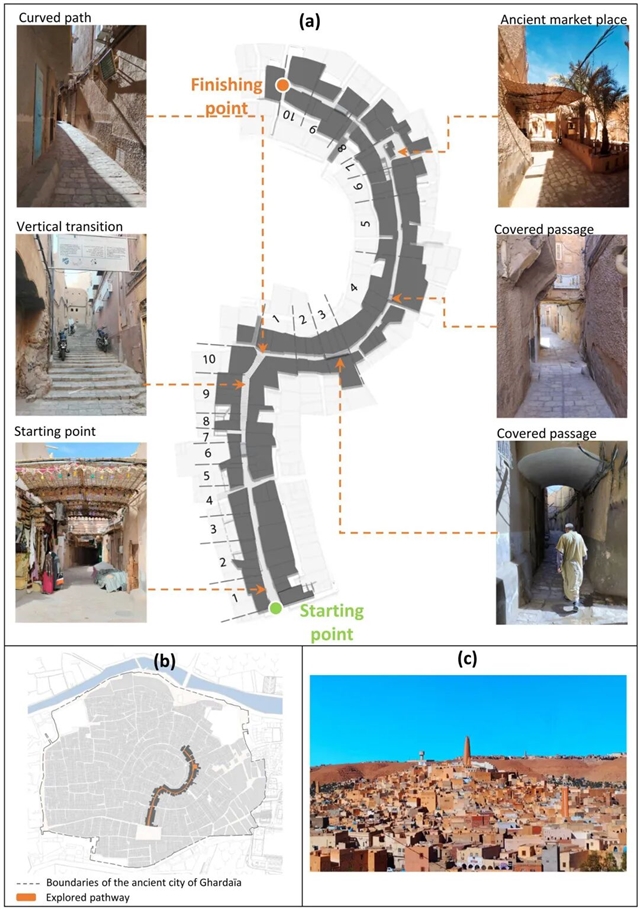 ▲ 图二:格尔达耶建筑语境下的探索路径。(a)选定路径及标注各实验条件分段的编号;(b)格尔达耶古城平面图,展示该乡土建筑肌理的复杂性,其中探索路径已用高亮标注;(c)古城景观视角图。©本文作者