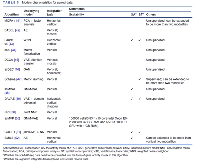 作者将整合任务数学化为:配对数据要求细胞级一一映射,以联合潜变量提升状态识别;非配对数据需在共享潜空间建立跨模态对应,实现标签迁移与协同聚类。据此,算法被归纳为因子分析(MOFA+)、加权近邻(Seurat v4)、深度循环注意力(DCCA)、对抗VAE(DAVAE)、最优传输(uniPort)及图卷积迁移(scGCN)等六大框架,并给出模型假设、复杂度与可扩展性指标。表1—表6系统比较了配对数据与非配对数据分析时常用的方法及这些方法的特点。