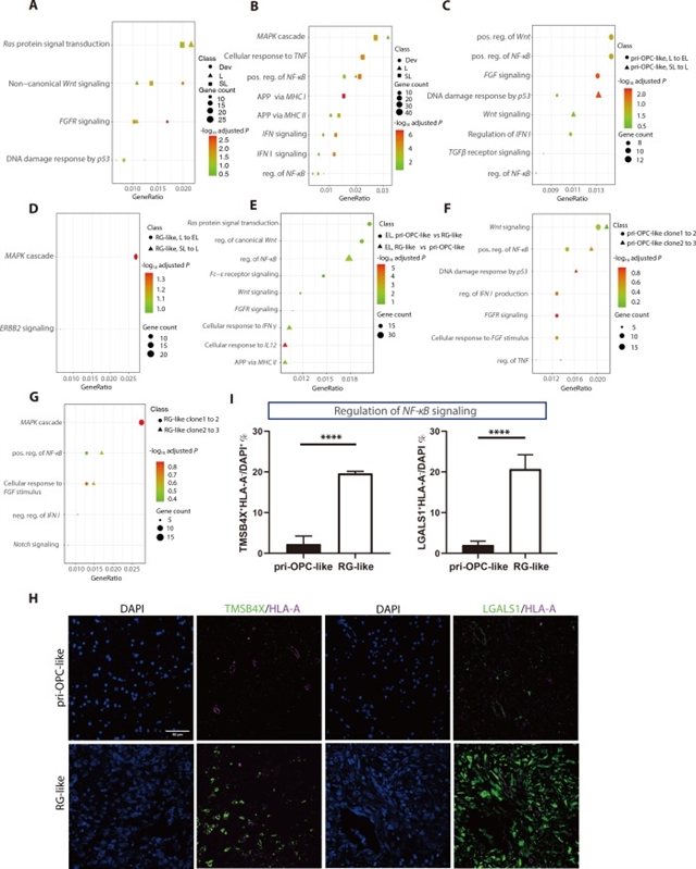 图5 RG样和pri-OPC样胶质瘤通过不同机制广泛重编程肿瘤浸润免疫细胞