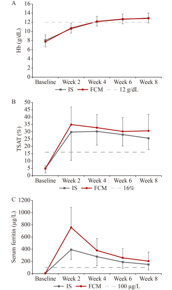 结果显示,羧基麦芽糖铁组和蔗糖铁组的血红蛋白反应率分别为99.4%和98.3%,组间差异为1.12%,其95%置信区间下限高于预设的-15%非劣效界值,证实羧基麦芽糖铁的疗效不劣于蔗糖铁。更值得注意的是,在治疗第2周的早期反应率上,羧基麦芽糖铁组显著高于蔗糖铁组,显示出更快的临床起效速度。血红蛋白水平在两组中均持续上升,至第8周时羧基麦芽糖铁组达到12.83±1.17g/dL,蔗糖铁组为12.93±1.07g/dL(图2)。转铁蛋白饱和度在第2周即显著升高,并维持在25%-35%范围内直至第8周;血清铁蛋白水平在第2周快速上升,随后逐渐下降。重复测量分析显示,羧基麦芽糖铁组患者在第2周时血红蛋白水平较基线的升高幅度显著高于蔗糖铁组,转铁蛋白饱和度较基线的变化在各随访时间点均显著大于蔗糖铁组,血清铁蛋白的基线变化值在所有时间点也均显著高于蔗糖铁组(图3)。