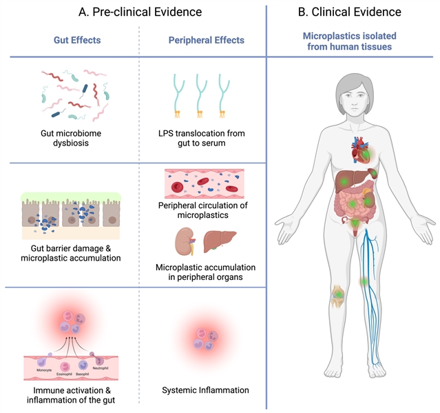 图片:口服微塑料暴露对肠道及全身影响的代表性示意图。(A)口服微塑料可引起肠道微生物群失调和肠上皮细胞损伤,增加肠道通透性并诱发肠道炎症;(B)微塑料可在心脏、肝脏、脾脏、肾脏、肠道及生殖器官等多种外周组织中积累。