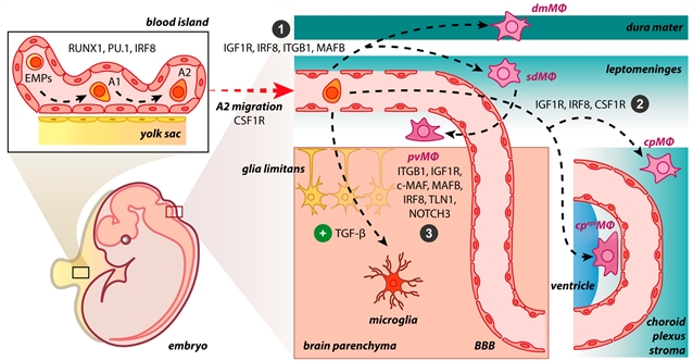 图片:发育中小鼠大脑中边界相关巨噬细胞的起源与扩增示意图。