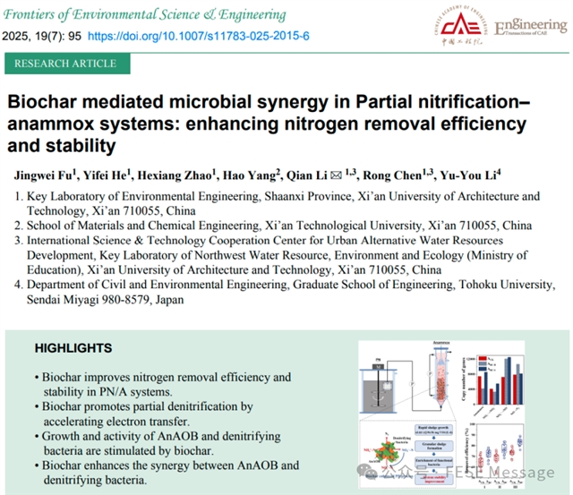 本文内容来自FESE期刊2025年第19卷第7期发表的研究文章“Biochar mediated microbial synergy in Partial nitrification–anammox systems: enhancing nitrogen removal efficiency and stability”。通讯作者为西安建筑科技大学环境与市政工程学院李倩教授。