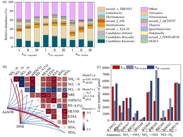 图2 (a)属水平微生物群落组成;(b)ABC组厌氧氨氧化菌(AnAOB)和反硝化菌(DNB)与环境因子的Mantel分析;(c)阶段III中氮代谢相关功能基因的拷贝数。