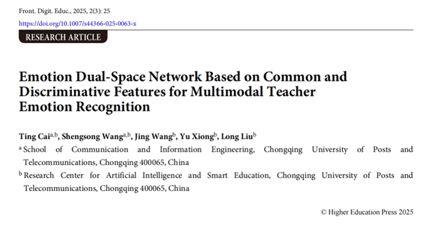 近日,重庆邮电大学人工智能与智慧教育研究中心、重庆市教育大数据研究中心熊余教授团队,在Frontiers of Digital Education(《数字教育前沿(英文)》)期刊上发表了一篇题为Emotion Dual-Space Network based on Common and Discriminative Features for Multimodal Teacher Emotion Recognition(《用于多模态教师情感识别的基于共性与辨别特征的情感双空间网络》)的文章。该文面向多模态教师情感识别数据集,提出一种新的情感双空间网络模型,显著提升了教师情感识别的准确性。