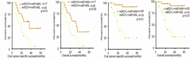 图1:双miRNA模型(miR-145与miR-21)在预测OSCC患者预后中的应用价值。结果显示,miR-145高表达且miR-21低表达的患者具有最佳预后,五年生存率最高,约为91.6%。该模型在患者风险分层和个体化治疗策略制定中具有潜在临床应用价值。