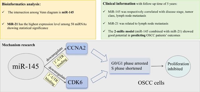 图2:miR-145在OSCC中的潜在作用。生物信息学分析提示miR-145与OSCC患者的治疗密切相关;基于大样本量的OSCC病例长期随访及生存分析显示,miR-145的表达水平与疾病分期、肿瘤分型及淋巴结转移等预后因素显著相关;机制研究进一步揭示,miR-145通过下调CCNA2和CDK6,干预细胞周期进程,从而抑制OSCC细胞的增殖。