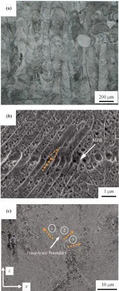 SLM样品中微晶粒边界(MPBs)的扫描电子显微镜图像。(a)与激光扫描方向平行的截面上的微晶粒边界;(b)与扫描方向垂直的截面形态;(c)“轨迹-轨迹”型微晶粒边界形态