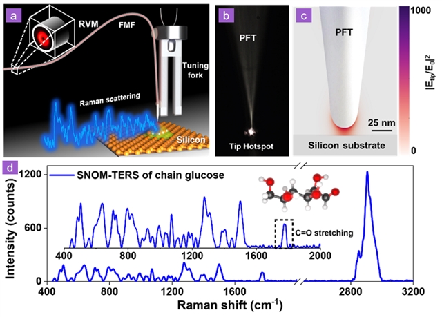 近日,西北工业大学物理科学与技术学院张文定教授、梅霆教授团队将光纤结构光场调控研究工作与扫描近场光学显微(SNOM)相结合,自搭建了针尖增强拉曼光谱术(TERS)平台,如图1(a)所示。该等离激元光纤探针基SNOM-TERS平台,可高效实现无背景针尖纳腔聚焦光源产生(图1(b)),且可将针尖纳米聚焦光源的电场强度提高2个数量级(图1(c))。得益于SNOM的剪切力反馈控制技术,其可精准调控针尖纳米聚焦光源与葡萄糖分子的空间位置关系,进而显著提高了葡萄糖分子的拉曼散射效率。如图1(d)所示,利用该SNOM-TERS平台,在400~3200 cm-1窗口内实现了葡萄糖分子拉曼振动模式的全谱激发,且利用观测到的C=O键伸缩振动,确认其为链状葡萄糖分子(图1(d)插图)。该光纤探针基SNOM-TERS平台为准确识别分子的拉曼散射提供了强大的工具,有助于生物分子物构解析技术的发展。该工作以“Tip-Enhanced Raman Scattering of Glucose Molecules”为题作为封面文章发表在Opto-Electronic Science 2025年第5期。