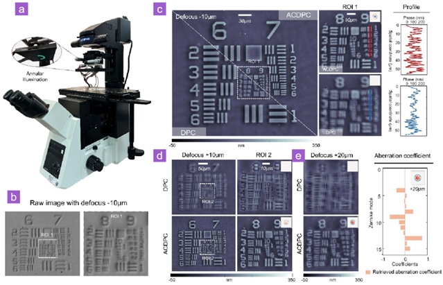 ACDPC方法通过环形优化照明与相位-像差联合重建算法,仅需三幅强度图像实现系统像差与物体相位的有效解耦,有效克服了传统差分相衬成像对系统像差敏感的难题,显著提升复杂光学系统下定量相位成像分辨率和鲁棒性,有望为活细胞动态过程的高精度相位定量分析提供了高鲁棒性技术方案。