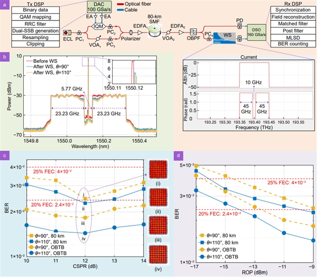 通过利用波形整形器构建最优的传递函数,研究人员完成了一个概念性验证实验。如图3所示,通过使用110°相移,在无星座整形的情况下,研究人员成功演示了46 GBaud 64-QAM信号传输80公里单模光纤,实现了228.85 Gb/s的净数据率和8.76 b/s/Hz的净电谱效率。对于传输距离大于40公里的直接检测传输实验,研究人员报道了单波长单偏振最高的净电谱效率。对于综合性指标2ESE×Reach,实现了直接检测传输实验中最高的2ESE×Reach。所提出的最优直接检测接收机可以为大容量和成本高效的数据中心互连、城域网和移动回传中的一些新应用提供可能。