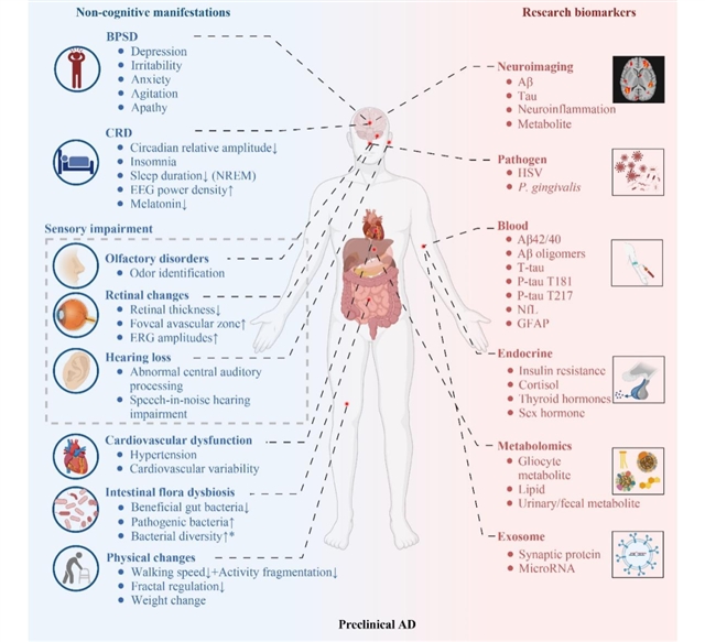 大连医科大学附属第一医院乐卫东等通过一项综述研究系统总结了阿尔茨海默病临床前期的非认知症状和新型生物标志物研究进展,并探讨了建立早期预测系统的潜力。