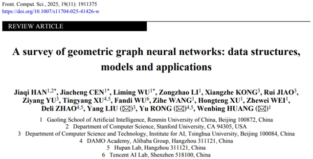Jiaqi HAN, Jiacheng CEN, Liming WU, Zongzhao LI, Xiangzhe KONG, Rui JIAO, Ziyang YU, Tingyang XU, Fandi WU, Zihe WANG, Hongteng XU, Zhewei WEI, Deli ZHAO, Yang LIU, Yu RONG, Wenbing HUANG. A survey of geometric graph neural networks: data structures, models and applications. Front. Comput. Sci., 2025, 19(11): 1911375