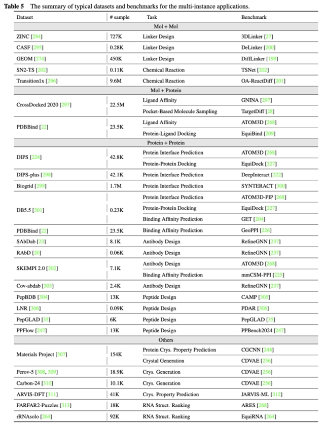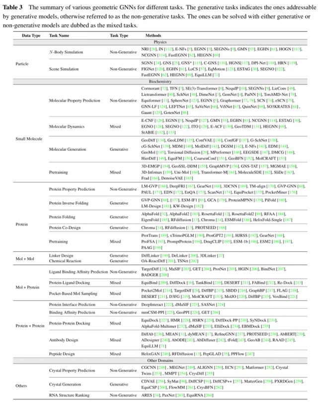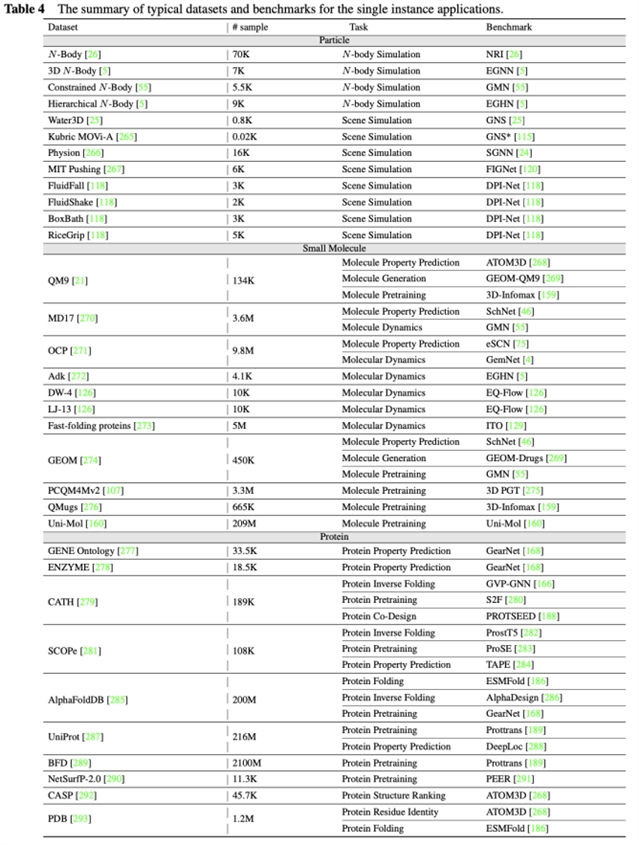 总体上,作者参考了300多篇参考文献,提出了三种几何图神经网络模型,讨论了针对粒子、分子和蛋白质等科学数据的23 项任务的方法,并调研了50多个评估数据集。