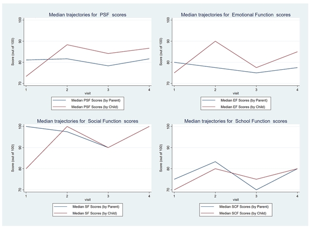 整体心理社会功能及各子领域的 PedsQL 轨迹