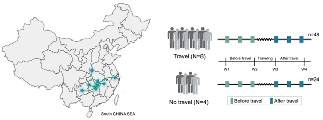 这项研究旨在探讨短期旅行对肠道微生物组动态变化的影响。研究团队招募了12名就读于中国湖南省长沙市中南大学的学生,并将其分为两组:旅行组 (8人) 和无旅行组 (4人),两组在性别、年龄、BMI及吸烟状况等方面无显著差异。所有参与者在研究前均于长沙居住至少6个月,且在采样期间未报告腹泻 (BSS评分>4)。旅行组的成员进行了为期一周的省内或跨省旅行 (距离115-860公里),并在旅行前一周及旅行后一周分别采集3次粪便样本。无旅行组的成员同样在对应时间节点进行样本采集,本研究纳入的队列总共包含72份样本 (每人6份)。通过16S rRNA基因测序分析微生物组成,并结合人口统计学、病史等元数据进行了综合评估。